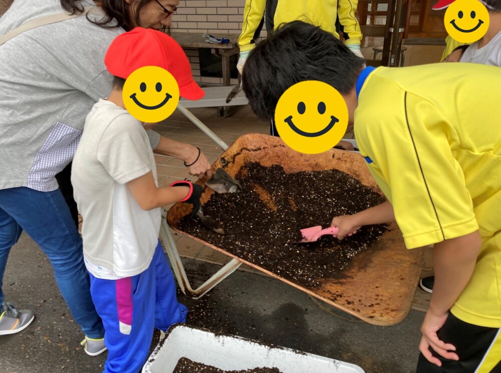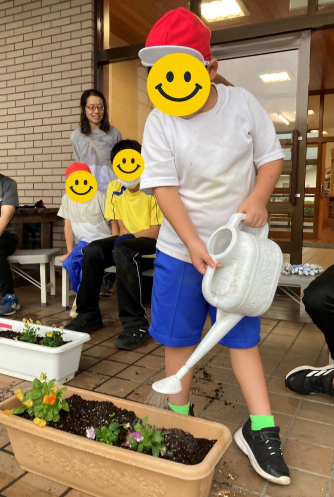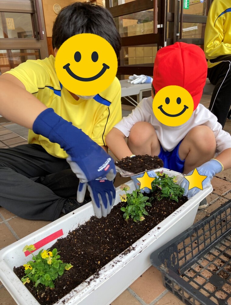 プランターに土入れをしたり、花の苗を植えたり、水やりをしたりと全校で協力して行いました。