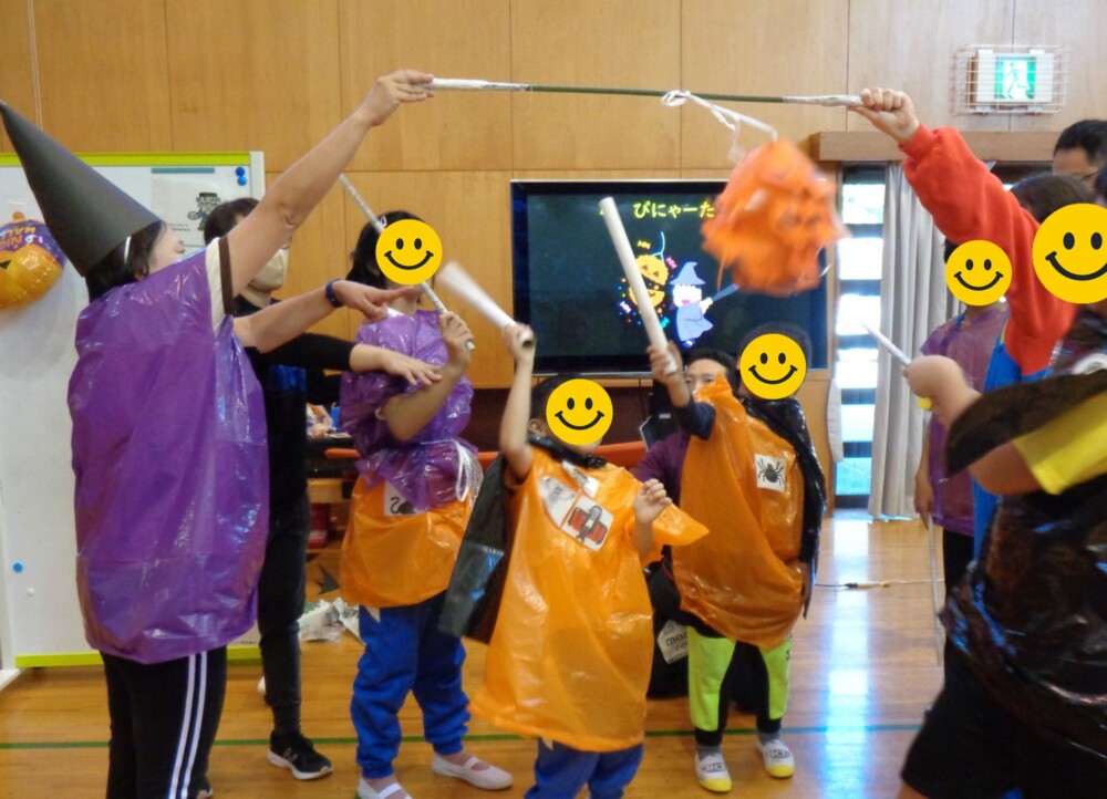 最後は、そのジャックオーランタンを吊るして、チームごとにピニャータをしました。みんな夢中でジャックオーランタンを叩きますが、なかなか割れません。やっと割れると落ちてきたお菓子に目を輝かせていました。楽しみながら外国の文化に触れることができました。