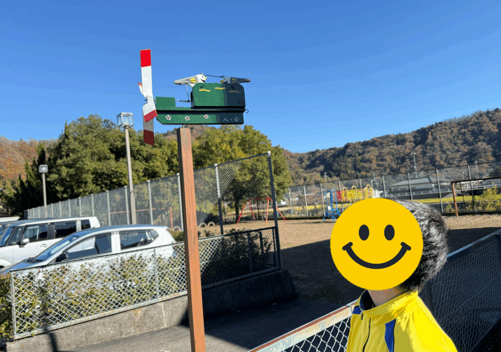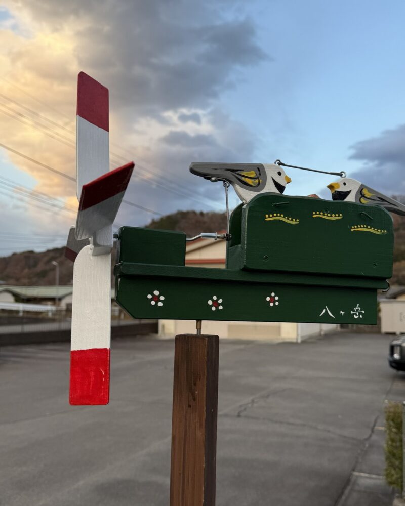 駐車場に設置されると早速子どもたちが興味深く見ていました。そよ風で風車が回ると、小鳥の飾りが気持ちよさそうに動いています。