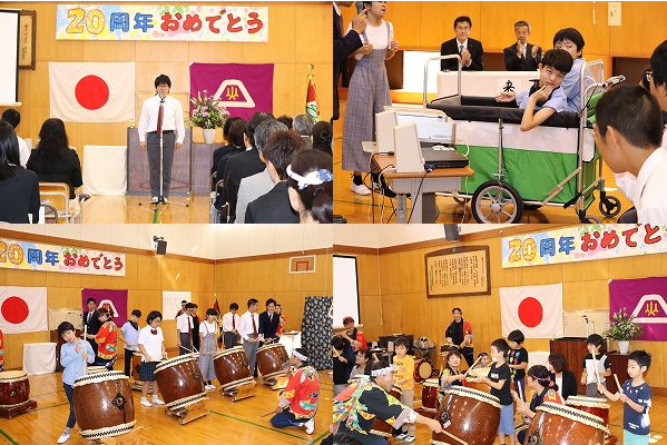 前半は、小学部6年生以上が参加する記念式典が行われました。来賓の方のご挨拶をいただくとともに、20周年を振り返るスライドショーが上映されました。また、PTAより寄贈されましたお散歩車の披露も行われました。