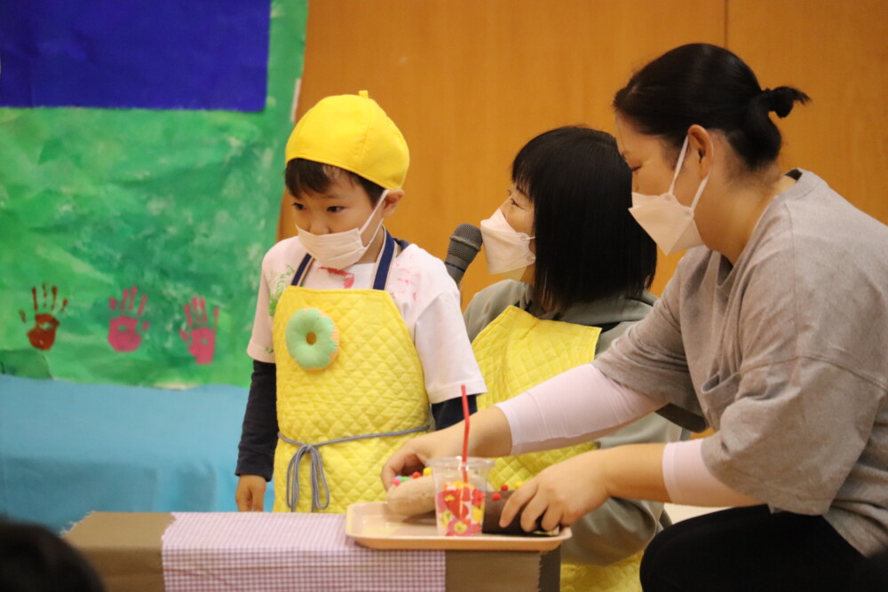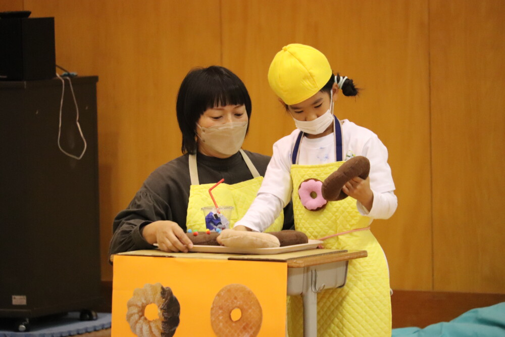 小低(1・2年生)は、7月に校外学習で行ったミスタードーナツを題材に、算数や踊りを取り入れた発表を行いました。