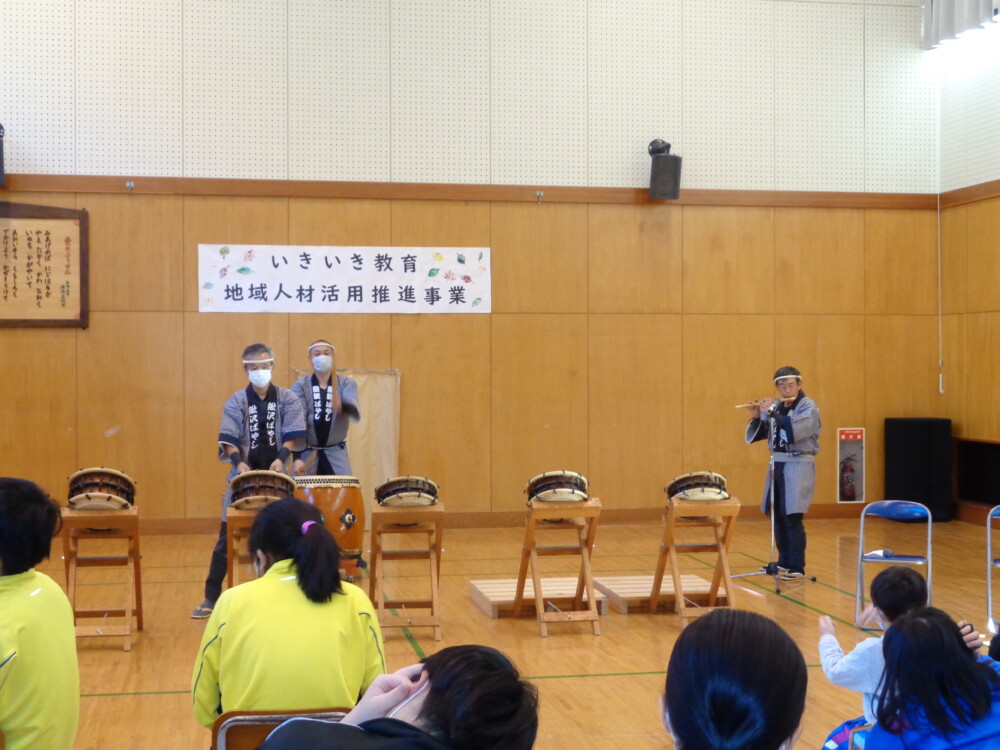 山梨県立わかば支援学校ふじかわ分校 > 活動の様子 > いきいき教育地域人材活用推進事業 2022年12月27日カテゴリー: 活動の様子 いきいき教育地域人材活用推進事業 いきいき教育地域人材活用推進事業で富士川町の「鰍沢ばやし保存会」の皆様に来校いただき、太鼓の演奏を鑑賞しました。迫力のある音に、自然と体を揺らしたり手拍子したりして楽しんでいました。体験では児童生徒の打つ太鼓に合わせて、保存会の方たちがお囃子を演奏してくださり、年の瀬のふじかわ分校がお祭りのように、にぎやかな雰囲気になりました。保存会の皆様、貴重な体験をありがとうございました。