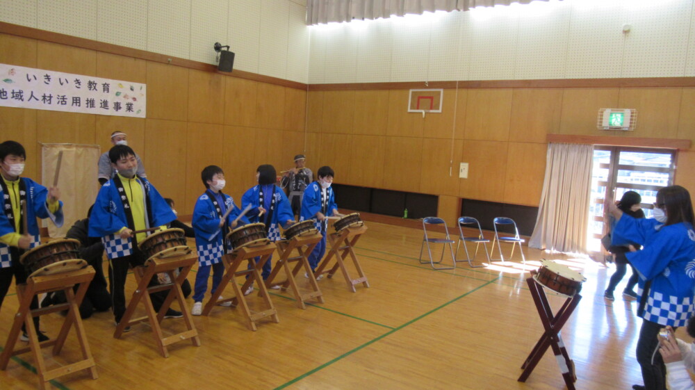 いきいき教育地域人材活用推進事業で富士川町の「鰍沢ばやし保存会」の皆様に来校いただき、太鼓の演奏を鑑賞しました。迫力のある音に、自然と体を揺らしたり手拍子したりして楽しんでいました。体験では児童生徒の打つ太鼓に合わせて、保存会の方たちがお囃子を演奏してくださり、年の瀬のふじかわ分校がお祭りのように、にぎやかな雰囲気になりました。