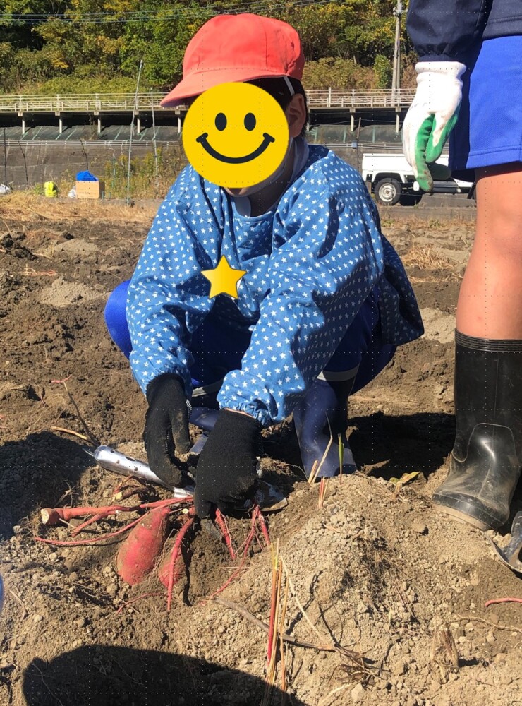 みんなはじめからやる気いっぱい。土の中からさつまいもを見つけると、勢いよくツルを引っ張ったり、いもを傷付けないように丁寧に掘ったりする姿が見られました。見事収穫すると、各々「取ったぞー」のポーズで喜びを表していました。