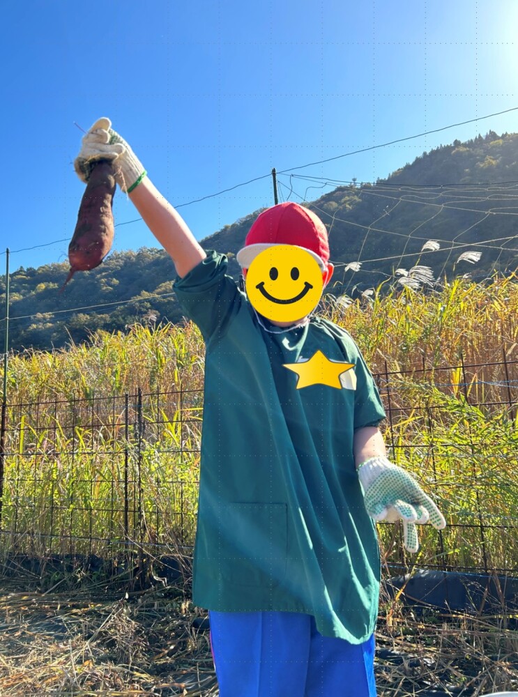 山梨県立わかば支援学校ふじかわ分校 > 活動の様子 > 地域交流~さつまいもほり~(小学部) 2023年12月7日カテゴリー: 活動の様子 地域交流~さつまいもほり~(小学部) 11月8日(水)、晴天の中、箱原地区の畑を訪問し、さつまいも掘りをさせて頂きました。 みんなはじめからやる気いっぱい。土の中からさつまいもを見つけると、勢いよくツルを引っ張ったり、いもを傷付けないように丁寧に掘ったりする姿が見られました。見事収穫すると、各々「取ったぞー」のポーズで喜びを表していました。 収穫したさつまいもは、12月になったら校内で焼き芋にしておいしく頂く予定です。 貴重な体験をさせて頂いた、中部地区活性化プロジェクト代表の依田様、ありがとうございました。
