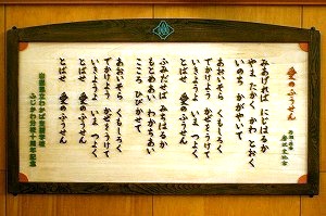 山梨県立わかば支援学校ふじかわ分校 > 校名・校章・分校歌 校名・校章・分校歌 校名 校名「わかば」の由来子どもたち一人一人が、がっちりと大地に根をおろし、わかばのように、すくすくと天に向かって伸びることを願って名付けられました。 校章 分校歌 愛のふうせん 作詞・作曲 唐沢史比古 見あげれば 虹はるか山高く 河遠くいのち 輝いて青い空 雲白くでかけよう 風をうけて生きようよ 今 つよく飛ばせ 愛のふうせん 踏み出せば 道はるか求めあい 分かちあい心 響かせて青い空 雲白くでかけよう 風をうけて生きようよ 今 つよく飛ばせ 愛のふうせん飛ばせ 愛のふうせん 10周年記念にPTAから贈られた、分校歌の木製プレート 。プレートは「多目的ホール」に架けられています。 分校歌を作詞・作曲した唐沢史比古先生。(10周年記念式典に来校したおり)